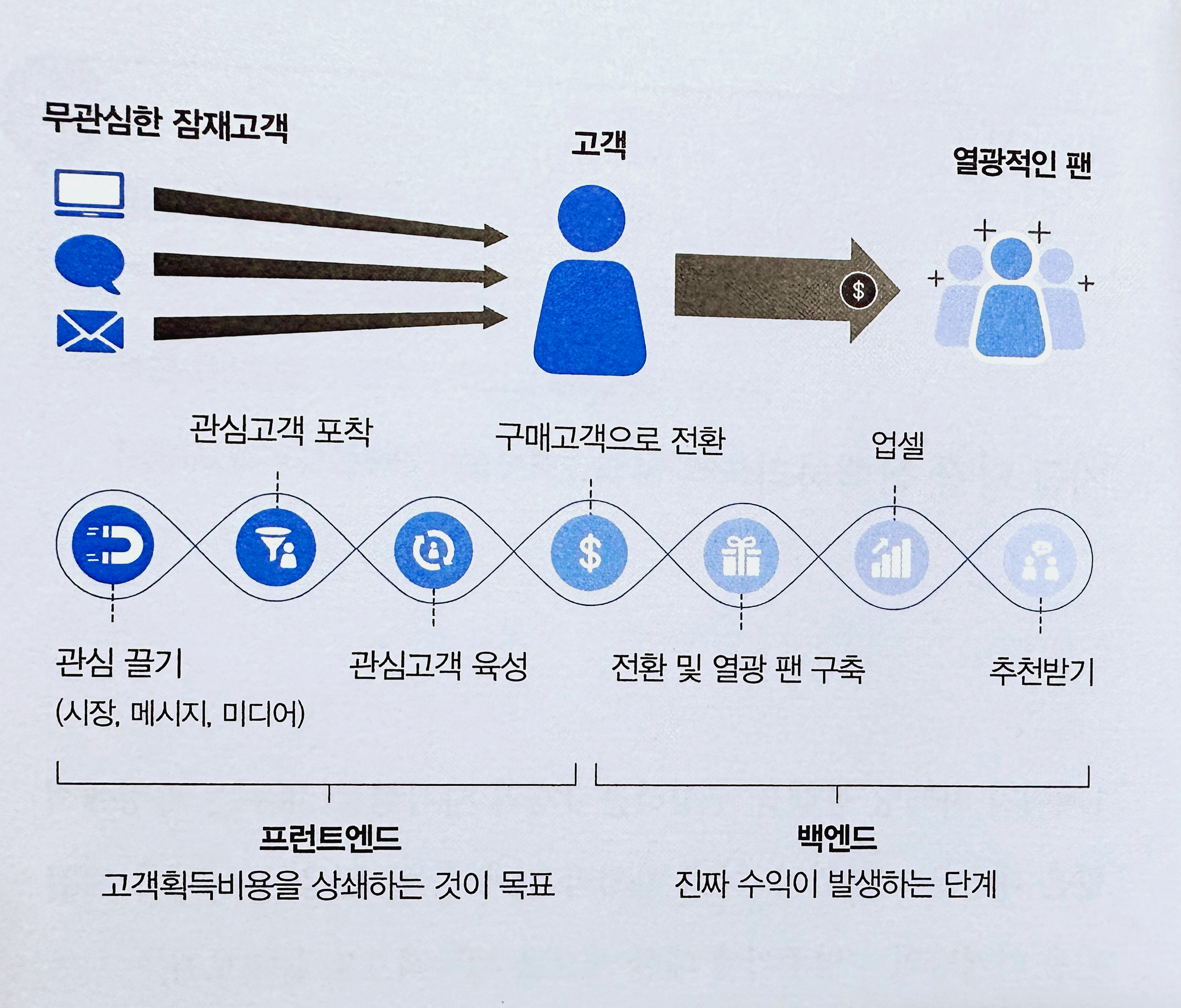 고객들은 이미 당신에게 돈을 지불했다. 한번 거래했다고 끝나는게 아니라 후속 단계가 계속 올바르게 실행되어야만 고객의 반복구매를 유도할 수 있고, 당신의 서비스의 팬이 되어 지속적으로 당신 회사를 추천하고 새로운 잠재고객을 소개하는 선순환이 이루어진다.