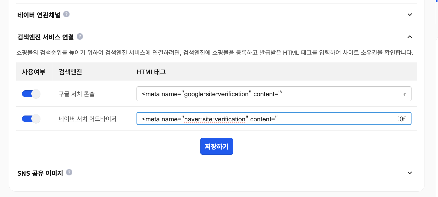 구글 서치콘솔 HTML 태그 붙여넣기하고, 사용여부 스위치 ON 하고 저장하기 버튼 클릭.