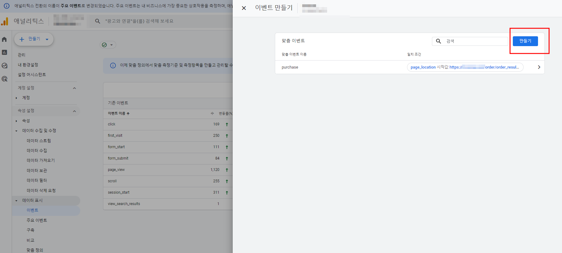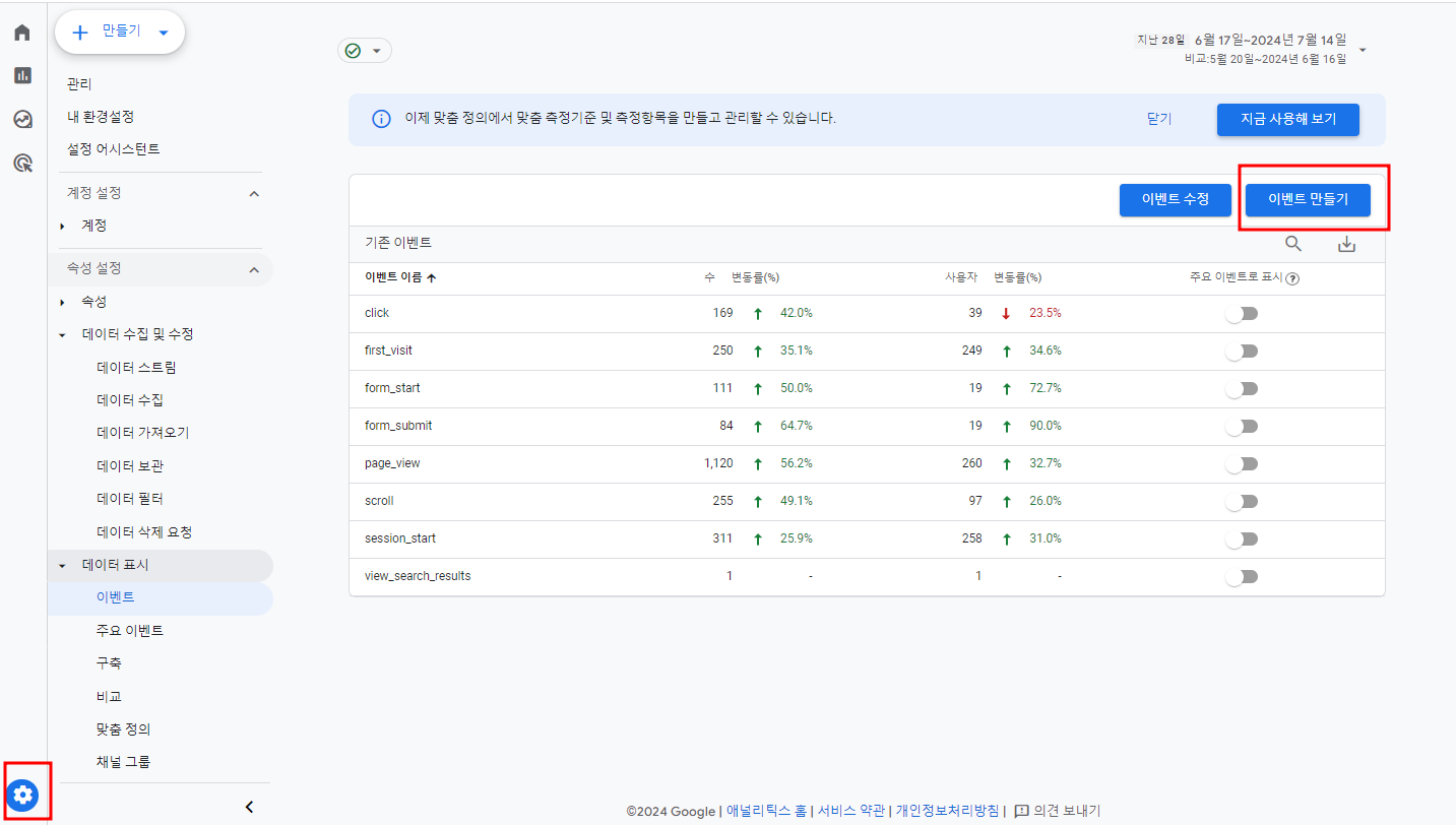 구글애널리틱스 GA4 접속 → 톱니바퀴(관리) → 속성 설정 → 데이터표시 → 이벤트 → 이벤트 만들기 버튼 클릭