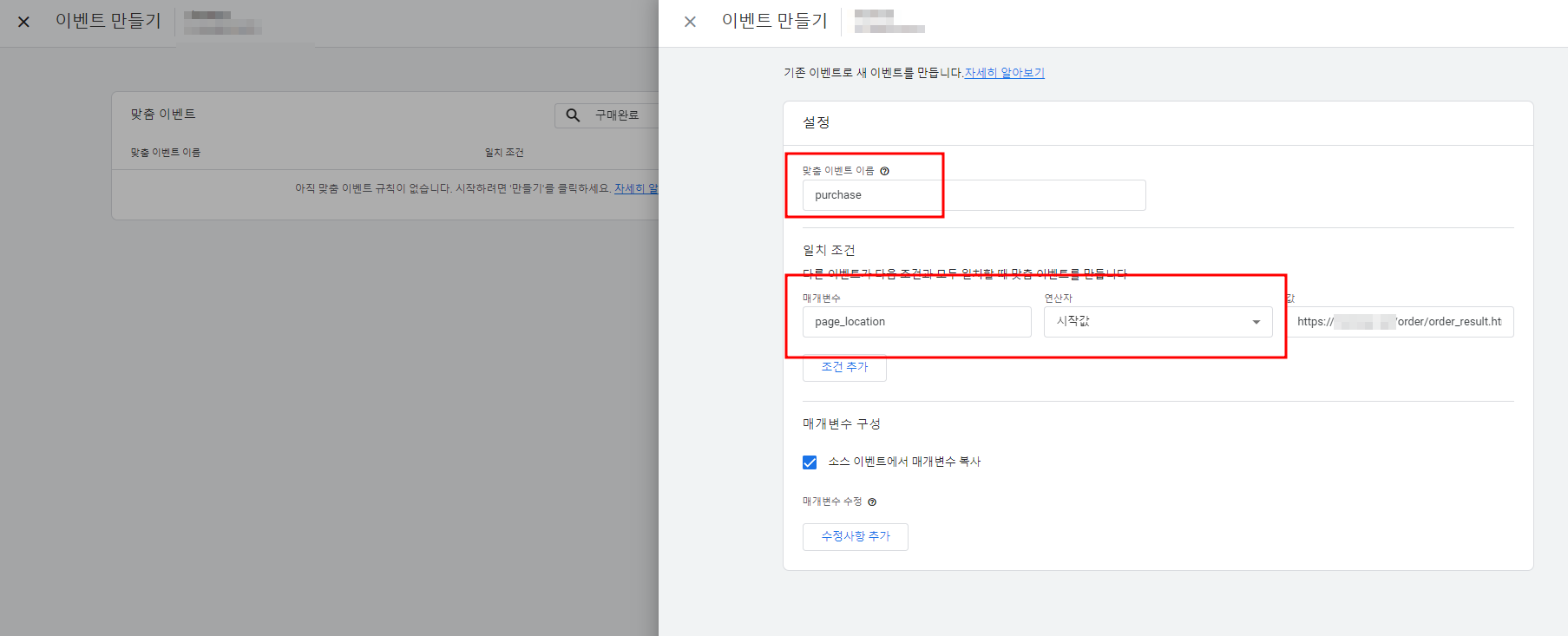 '일치 조건' 에서 매개변수는 'page_location' 으로 선택해주기