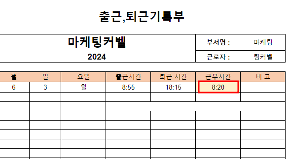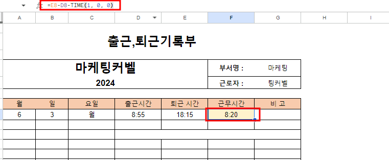 출퇴근 기록부에 출근시간을 입력하고, 퇴근시간을 입력한 후에 점심시간 1시간을 빼서 총 근무한 시간이 몇시간 몇분인지 계산하려면 생각보다 잘 안됩니다.