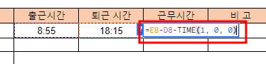 = 퇴근시간 적혀있는 셀 - 출근시간 적혀있는 셀 - Time(1,0,0)
