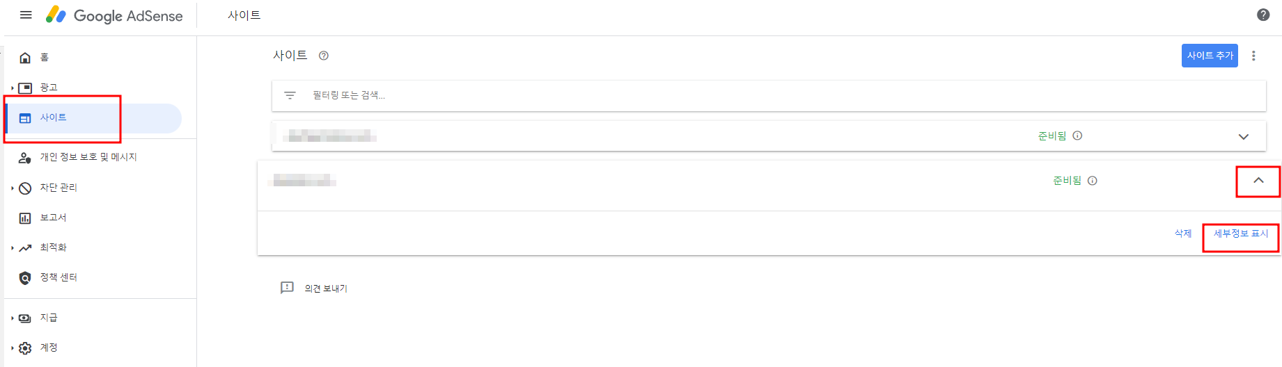 이미 애드센스 승인을 받은 사이트 주소 오른쪽에 화살표 모양 클릭 -> 세부정보표시 클릭