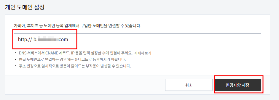 개인 도메인 설정에서 "도메인 연결하기" 버튼 클릭