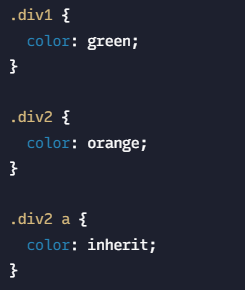 위에 적어둔 속성들도 항상 상속 되는 건 아닙니다. 대표적인 예로 <a> 태그는 color 속성이 상속되지 않습니다. <a> 태그가 억지로 상속을 받아오게 하려면, 해당 속성에 inherit 값을 쓰면 상속받아 올 수 있습니다.