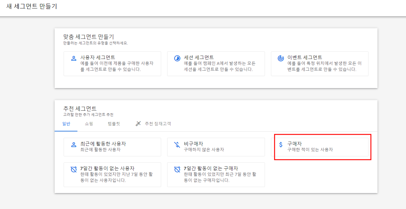 새 세그먼트 만들기에서 "구매자" 세그먼트 먼저 만들어보자