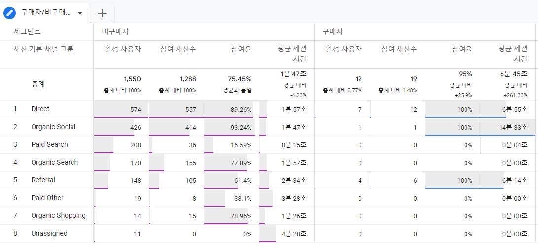 같은 방법으로 세션 소스/매체 별 비구매자, 구매자 비율 데이터를 보고 싶다면