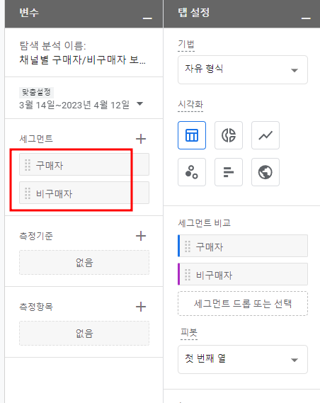 지정한 기간에 채널별 구매자/비구매자 비율을 볼 수 있는 보고서를 만들어 보자