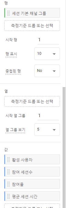 탭 설정 쪽에서 "행" 에는 측정기준을 선택해주고, "값" 에는 측정항목을 선택해 준다.