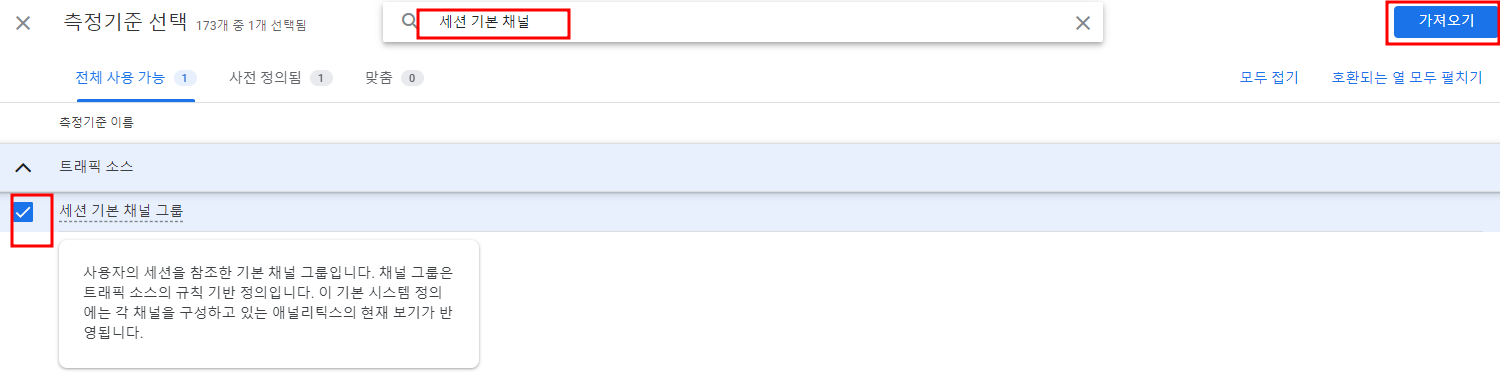 "세션 기본 채널" 검색해서 체크하고 "가져오기" 버튼 클릭