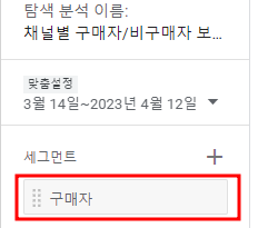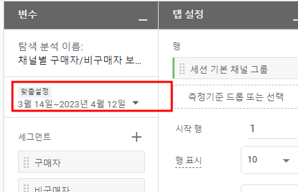 지정한 기간에 채널별 구매자/비구매자 비율을 볼 수 있는 보고서를 만들어 보자