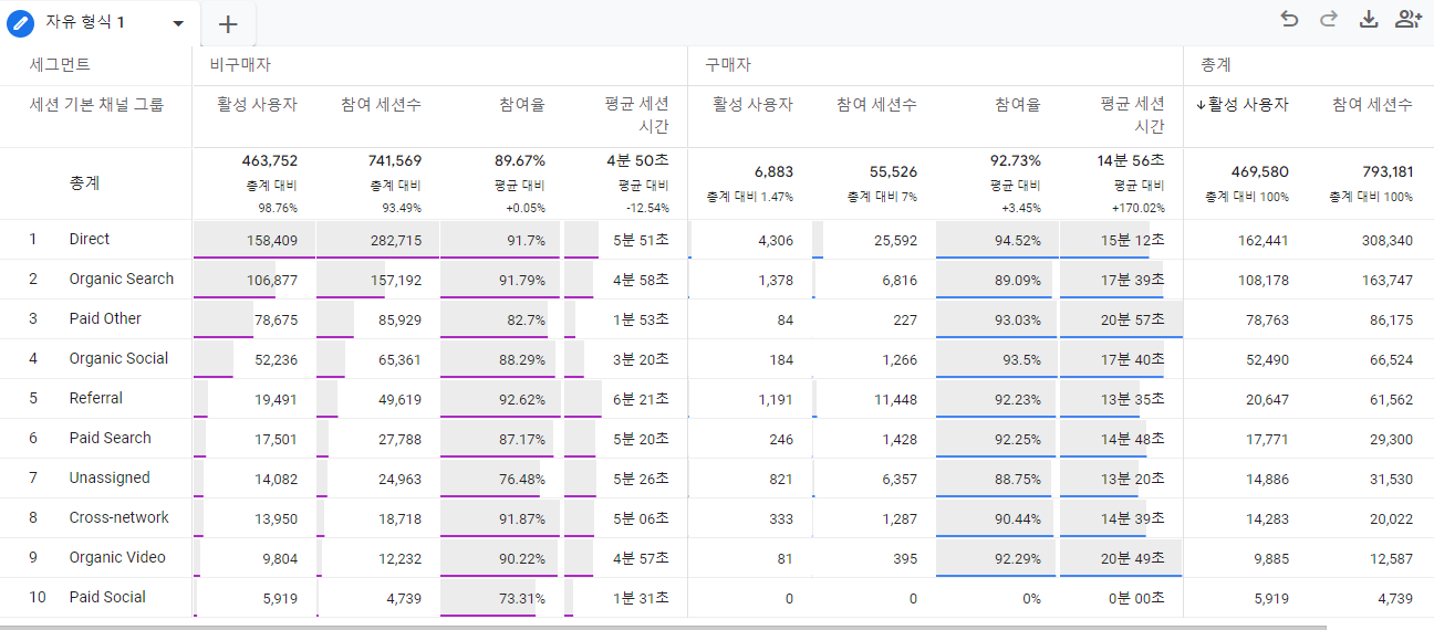 GA4) 세션 기본 채널별 구매자/비구매자 보고서 만들기 (탐색 분석)