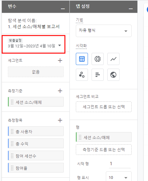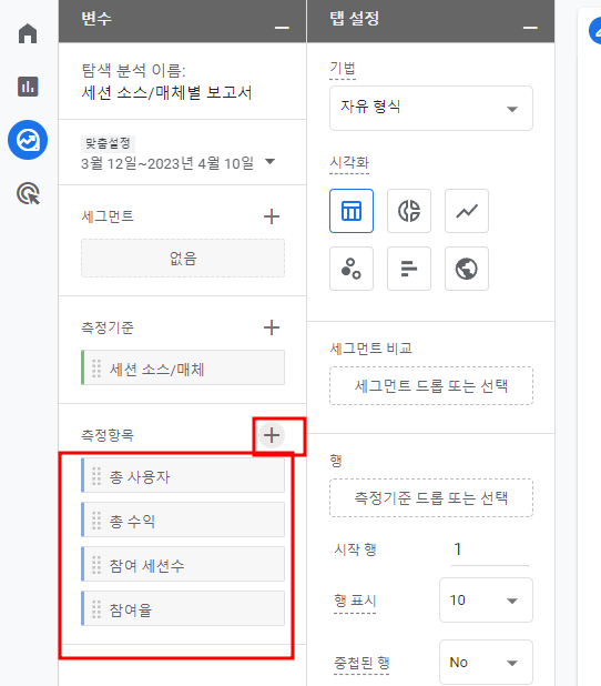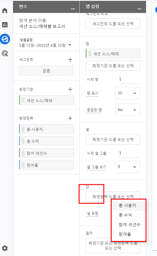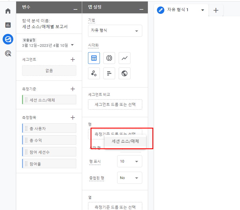 방금 선택했던 측정기준이 "행"이 될 것이고