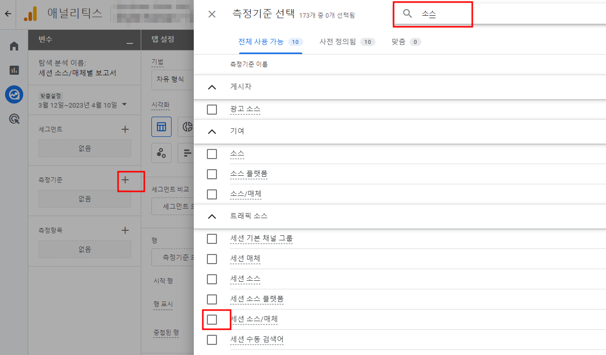 측정기준 추가 해주기 위해 + 버튼 클릭 -> "소스" 검색해서 세션 소스/매체 선택