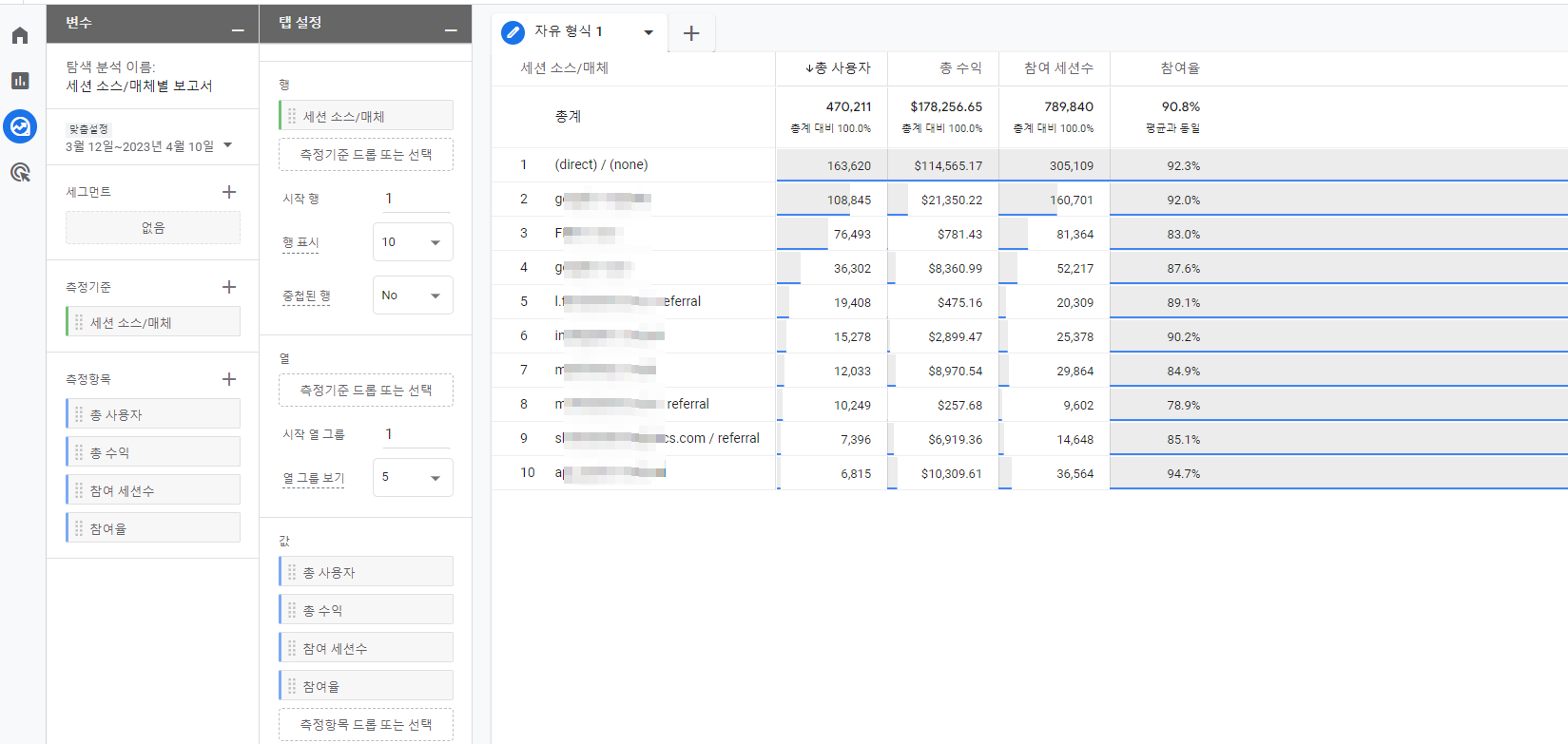 ㄴ 총 사용자, 총 수익, 참여 세션수, 참여율