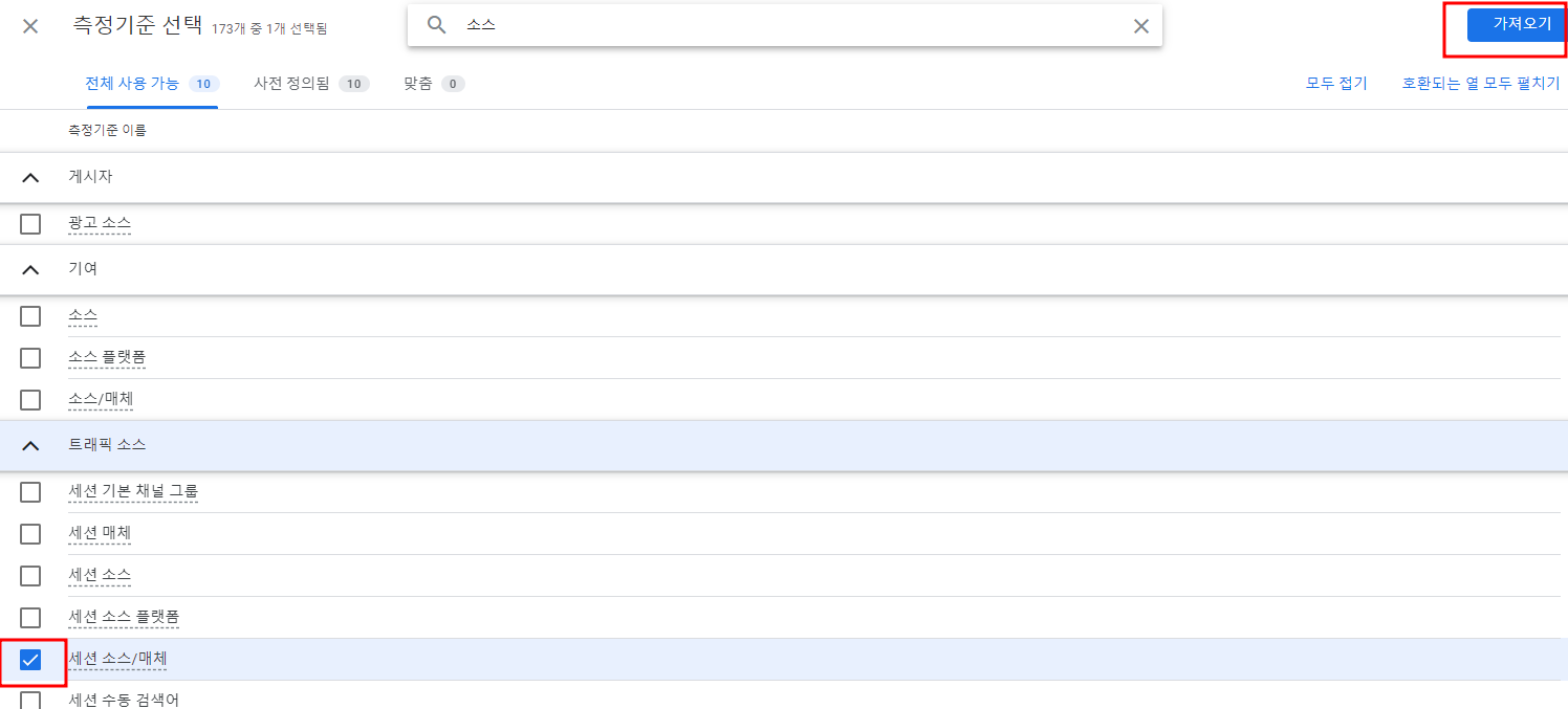 측정기준 추가 해주기 위해 + 버튼 클릭 -> "소스" 검색해서 세션 소스/매체 선택