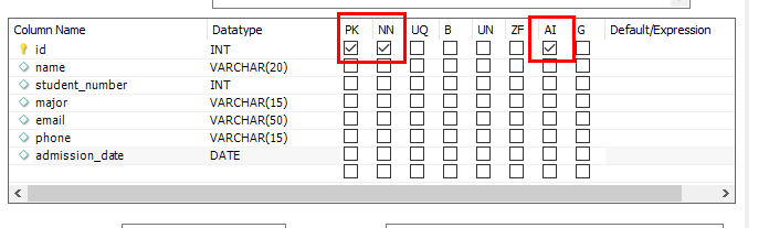 AI : Auto Increment 점점 증가하는 숫자값을 MySQL이 자동으로 넣어준다