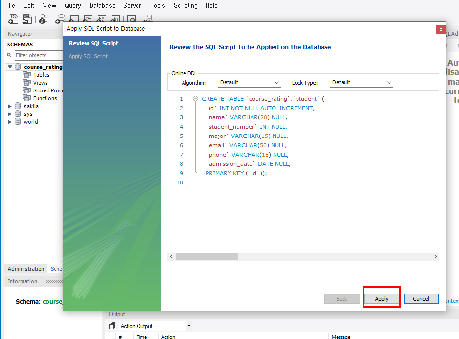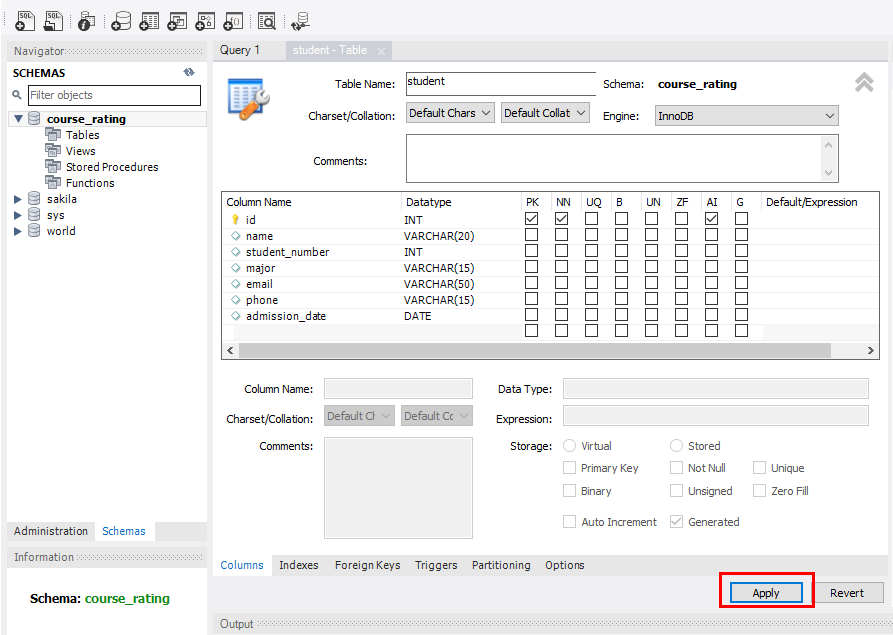 칼럼들을 모두 생성했으면 아래쪽 하단에 Apply 버튼 클릭