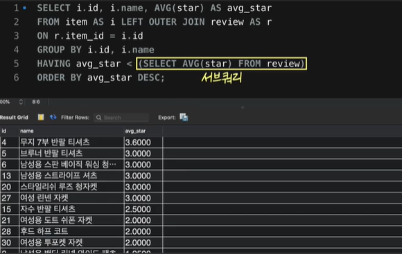 노란부분이 서브쿼리의 alias
