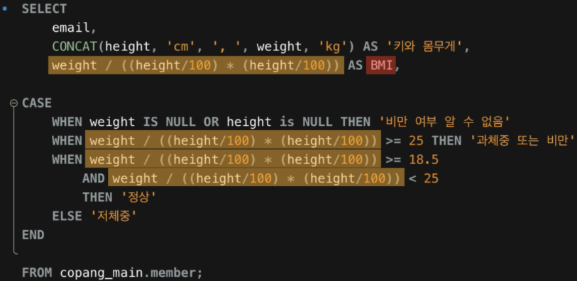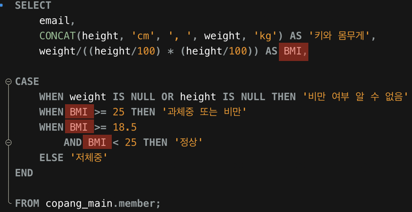 CASE 함수가 실행될 때는 BMI라는 alias가 아직 인식되지 않은 상태이기 때문에 오류가 난다.
