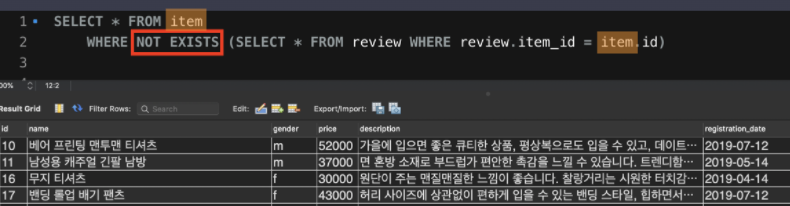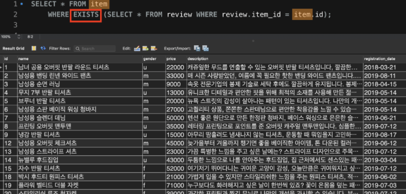 EXISTS 뒤에 나오는 서브쿼리만 별도로 빼서 실행해보면, item이라는 테이블 이름이 FROM 절에 없기 때문에 실행에 실패한다.