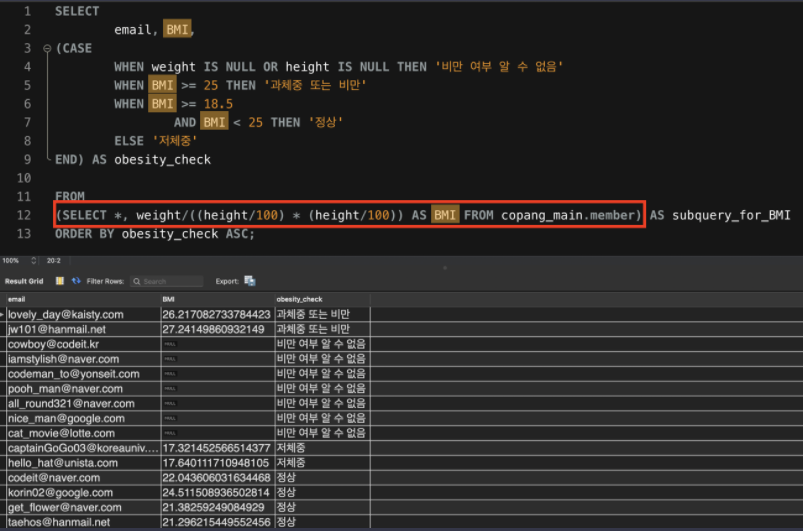 이렇게 서브쿼리를 사용하여 subquery_for_BMI 라는 derived table 을 생성했다.