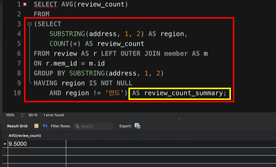 빨간부분이 서브쿼리 (FROM절 뒤에 derived table을 생성시킨 서브쿼리)