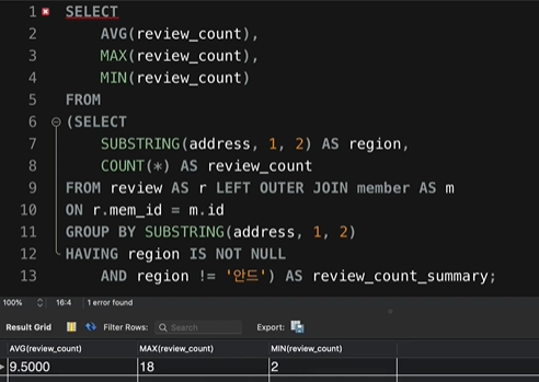 FROM 뒤에서 서브쿼리로 derived table 을 생성 시키면 alias 를 꼭 붙여줘야한다.