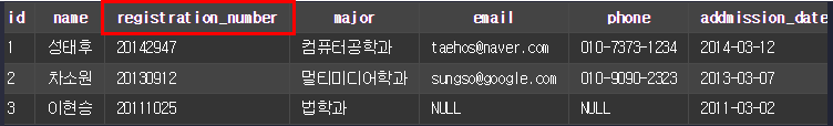 아래 student 테이블에서 admission_date 라는 컬럼을 없애보자