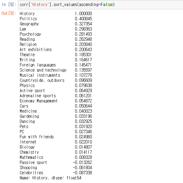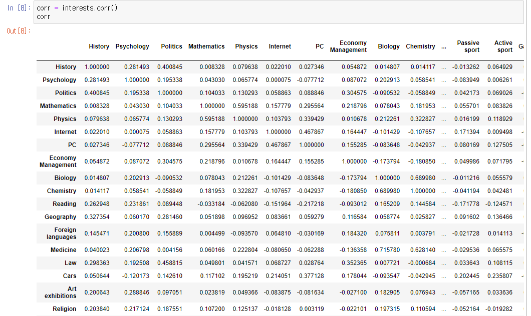 interests = df.loc[:, 'History':'Pets'] # df 에서 row는 전부 선택하고 column은 History 부터 Pets 까지 선택해서 interests 에 넣음