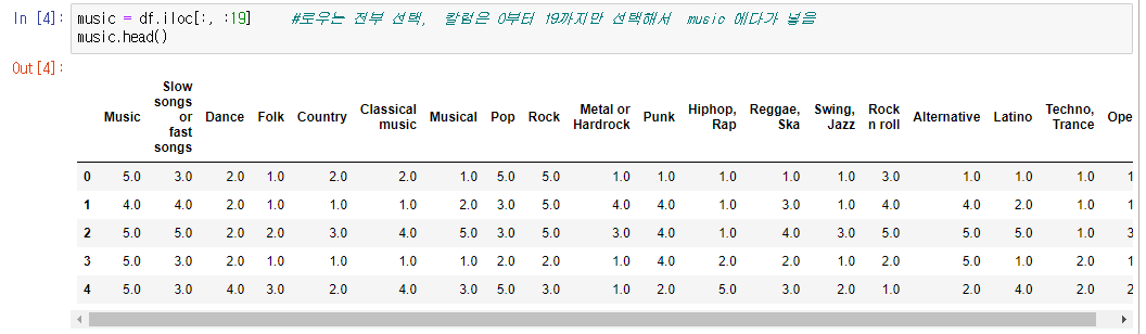 music = df.iloc[:, :19] #로우는 전부 선택, 칼럼은 0부터 19까지만 선택해서 music 에다가 넣음