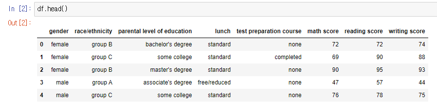 데이터프레임 df 의 0~4행 까지 보여달라는 의미