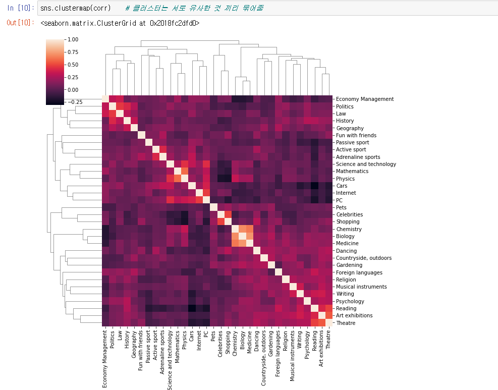 interests = df.loc[:, 'History':'Pets'] # df 에서 row는 전부 선택하고 column은 History 부터 Pets 까지 선택해서 interests 에 넣음