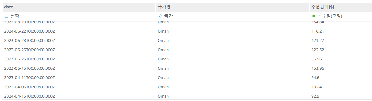 아래와 같이 날짜, 국가명, 주문금액 세가지 컬럼만 있으면 된다.