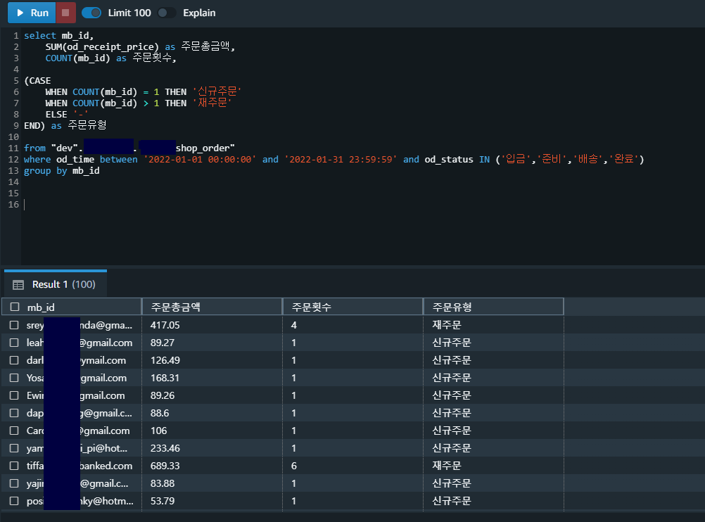 WHEN COUNT(mb_id) = 1 THEN '신규주문'