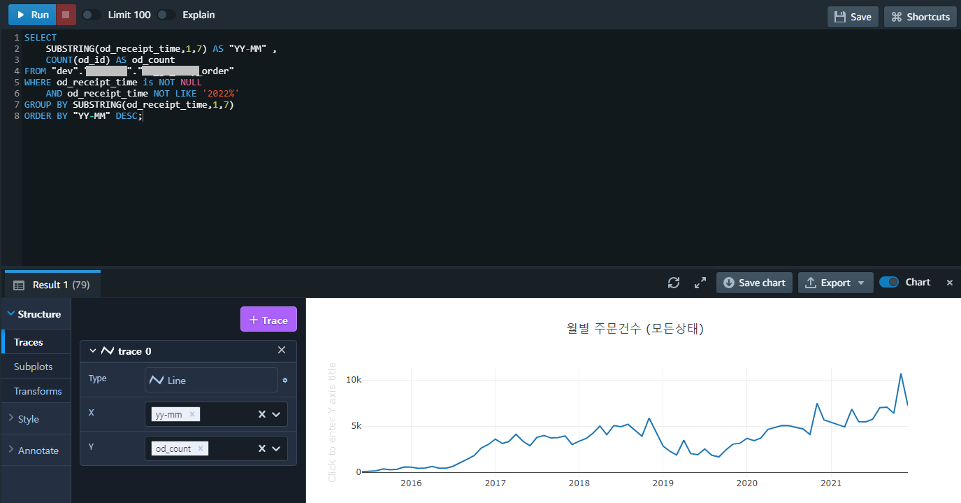 ㄴ od_receipt_time 컬럼에서 1번째 문자열부터 7개까지만 사용하겠다.