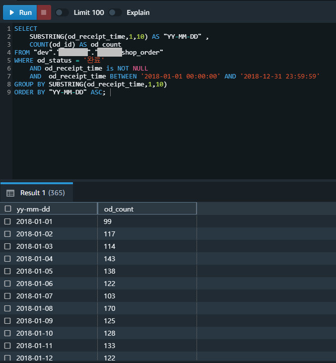 ㄴ od_receipt_time 컬럼에서 1번째 문자열부터 7개까지만 사용하겠다.