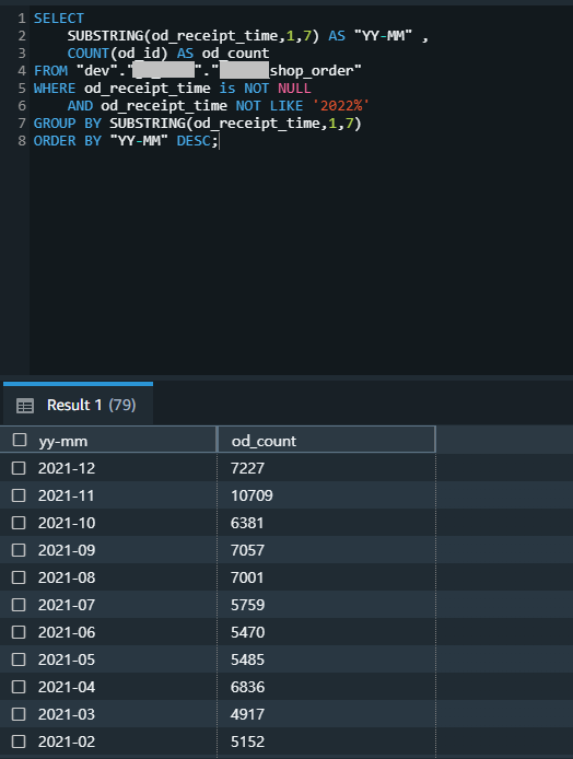 GROUP BY SUBSTRING(od_receipt_time,1,7)
