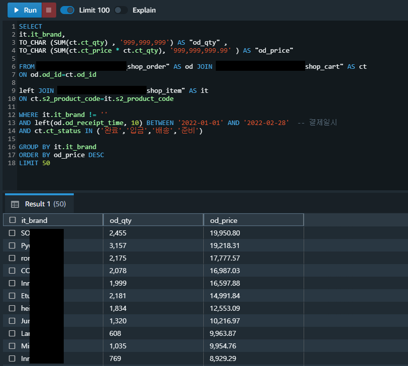 우리 회사 DB 구조 상, 브랜드별 판매수량, 금액을 추출하기 위해서는