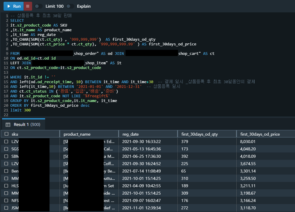 AND left(od.od_receipt_time, 10) BETWEEN it_time AND it_time+30 -- 결제 일시 _상품등록 후 최초 30일동안의 결제