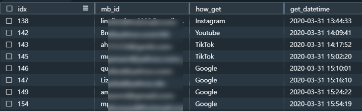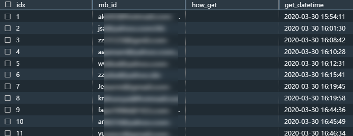 idx, mb_id, how_get, get_datetime 이렇게 4개 컬럼이 존재한다.