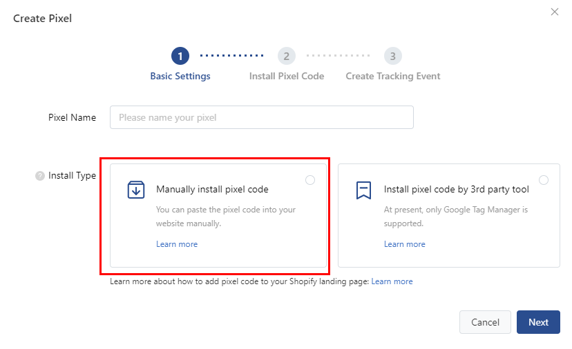 Manually install pixel code를 클릭하여 나온 스크립트를
