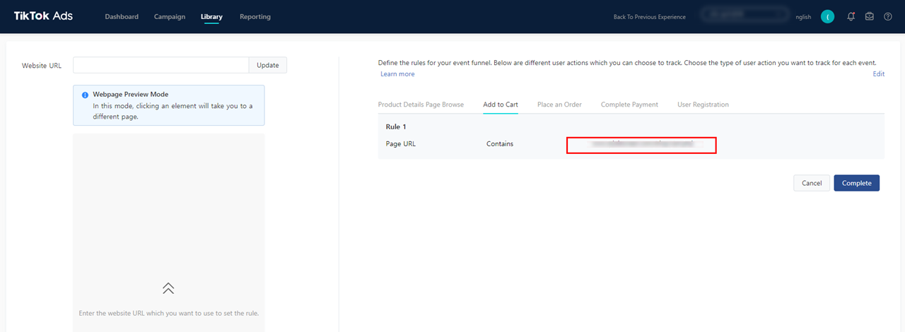 Page URL ,  Contains 조건을 선택하고  url에는 내 웹사이트 카트페이지 url 입력.