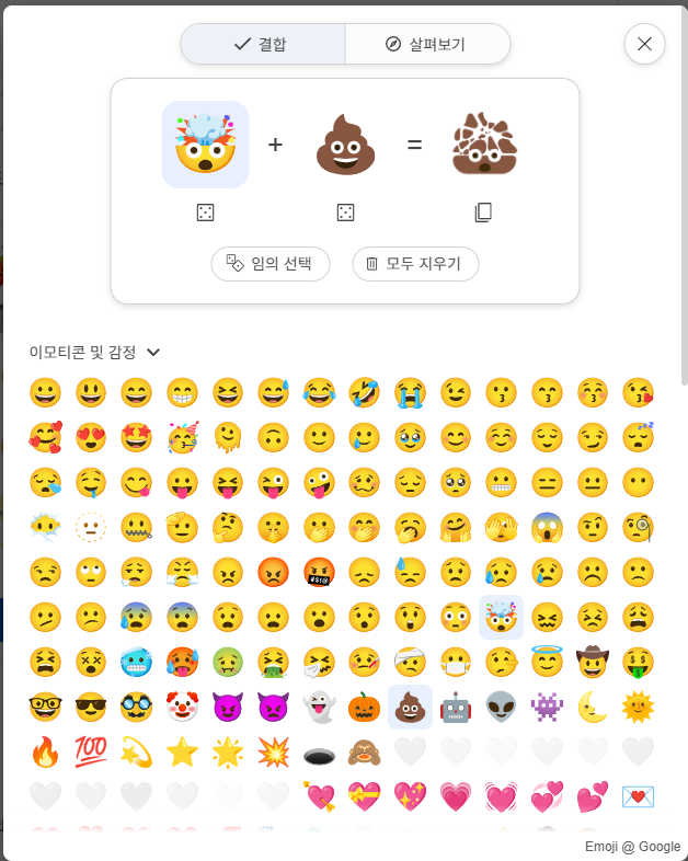이모지를 두가지 선택하면 두 이모지를 조합한 새로운 그림이 나오는데 너무 귀엽습니다. ㅋㅋㅋ