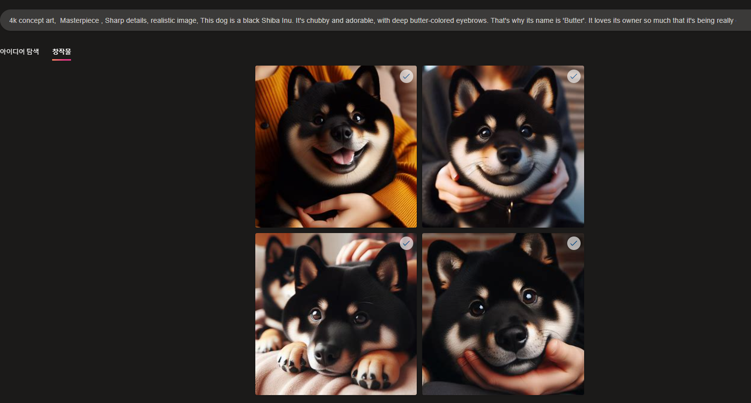 아이디어 탐색 탭에 나오는 그림들에 마우스를 올려두면, 어떻게 명령했길래 이런 그림이 나온건지 제시어를 볼 수 있습니다.